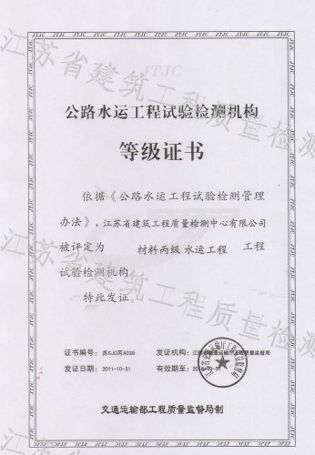 近日,省检测中心获得江苏省交通运输厅工程质量监督局颁发的水运工程试验检测机构丙级资质,被核准在全省交通建设领域内开展业务范围内的试验检测工作。 省检测中心非常重视交通领域试验检测工作的开展,为了在交通建设领域做好技术服务工作,中心向省交通运输厅工程质量监督局提交了检测资质申请。公司上下积极努力,从完善水运工程检测制度、加强质量管理入手,在检测设备投入、检测人员培训和上岗考试等方面做好了积极而充分的准备工作。 根据交通部相关规定,组织专家评审组对省检测中心进行现场评审,经过评审专家认真而细致的评审,中心完全符合《公路水运工程试验检测管理办法》和《公路水运工程试验检测机构等级标准》规定的水运材料丙级条件要求,中心正式取得水运工程材料丙级的资质证书。 此次水运工程资质是省检测中心在检测能力和资质方面实现的又一次领域突破,为中心检测业务的领域、地域拓展又迈出了扎实的一步。